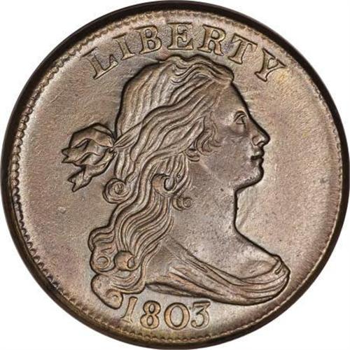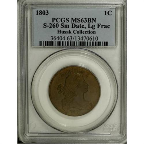 <B>1803 1C Small Date, Large Fraction. MS63 Brown PCGS. S-260, B-19, R.1.</B></I> <B>Bland MS61; CC-1. Noyes AU55; tied for CC-2. Photo #21219. Our EAC Grade MS60.<BR><BR>Equivalents. </B></I>Proskey 17; Doughty 195; McGirk 17A; Ross 17; Newcomb 18; EAC 19; <I>Encyclopedia </B></I>1757; PCGS #1485.<BR><B><BR>Variety. </B></I>Small Date. Wide LIBERTY, base of 3 strengthened. Large Fraction. Long fraction bar. The obverse appears on S-259 and S-260. The reverse appears on S-260 and S-261.<BR><B><BR>Surfaces.</B></I> Older collectors enjoyed imaginative descriptions that are often lost today. For example, at one time this piece would have been called a "golden biscuit" to describe its desirable golden-brown color. Each side has some darker toning, and the surfaces retain considerable luster. A lighter colored toning spot is positioned below the right side of the B.<BR><BR><B>Die State III. </B></I>Clash marks nearly surround Liberty's head, with faint clash marks also visible on the reverse. The obverse has a small die bulge left of the low curls.<BR><BR><B>Commentary. </B></I>Our illustration does not match the Stack's 3/1998 plate.<BR><BR><B>Provenance. </B></I><I>Francis Lee (1913); Essex Institute; Stack's (1975), lot 157, $2,700; RARCOA; New England Rare Coin Galleries; Superior (10/1977), lot 176, $1,150; Jack Beymer (1979); R.E. Naftzger, Jr. (2/1992); Eric Streiner; Early American Coppers (4/1994), lot 287, $3,000; Anthony J. Terranova; Stack's (1995 FPL), lot 95, $5,850; Stack's (11/1995), lot 1033, $3,080; Stack's (3/1998), lot 54; Chris Victor-McCawley (7/2005).</B></I><BR><BR><B>Personality. James Halperin,</B></I> born in Boston in 1952, began his numismatic business in 1967 at the age of 15. He operated New England Rare Coin Auctions in the 1970s. In 1979, the firm conducted the ANA Convention auction. Now a partner with Steve Ivy, Greg Rohan, Paul Minshull, and Marc Emory in Heritage Auctions, Halperin remains active in the rare coin field, attending major conventions on a regular basis. In 2004, he won the professional division of the PCGS World Series of Grading. Halperin is also a part-time novelist, author of <I>The Truth Machine</B></I> and <I>The First Immortal.</B></I> All royalties of his part-time venture are donated to charity.<BR><BR><b>Shipping:</b> Coins & Currency (<a target="_blank" href="http://www.heritageauctions.com/common/shipping.php">view shipping information</a>)