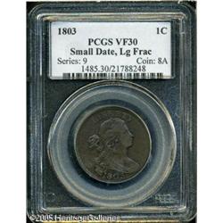 <B>1803 1C Small Date, Large Fraction VF30 PCGS.</B></I> S-261, Die State II, High R.2. This is an early stage of die state II, without any evidence of the die crack that begins to form from the border between 8 and 3 to the drapery. In later states, this die crack curves up to the left obverse border. Eventually, the obverse die was used outside the Mint to produce the 1804 Restrike cents. Attractive olive-brown with darker steel and traces of corrosion. Lot:5131