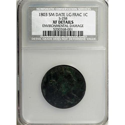 <B>1803 1C Small Date, Large Fraction--Environmental Damage--NCS. XF Details.</B></I> S-258. NGC Census: (2/5). PCGS Population (5/35). Numismedia Wsl. Price for NGC/PCGS coin in XF40: $635. (#1485)<BR><BR><B>Coin Engraver:</B> Robert Scot<BR><BR><b>Shipping:</b> Coins & Currency (<a target="_blank" href="http://www.heritageauctions.com/common/shipping.php">view shipping information</a>)