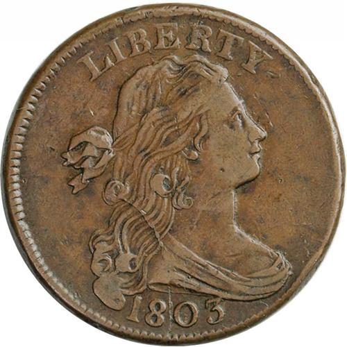 <B>1803<1C> Small Date, Large Fraction. S-261, B-20, High R.2. XF45 NGC. VF25 EAC.</B></I> Die State III. The obverse of this variety has a wide, even date with the 3 embedded in the drapery. The hallmark of this die state is a long crack that arcs from between the 80 in the date, through the drapery, the lower tresses, and the ribbon to rejoin the rim at about 9:30. On this specimen the crack has developed enough to cause two different planes on the coin, with the area to the left of the crack more recessed. This deeper plane is confirmed by following Liberty's hair across the crack, as it shows less wear on the left side of the crack than on the right. This example is medium-brown and appealing, showing few distractions under a glass except for a small, semicircular dig to the left of the 1 in denominator. This coin occupies a middle position in the expanded Condition Census in Breen's large cent <I>Encyclopedia,</B></I> which lists 14 coins ranging from MS61 to XF40.<BR><I>Ex: Bandonis (12/1/1966).</B></I> Envelope Included.