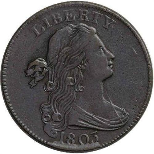 <B>1803<1C> Small Date, Small Fraction. S-263, B-22, R.3--Environmental Damage--NCS. AU Details. VF35 EAC.</B></I> Die State V. On the obverse, a heavy rim break on 1803 extends beneath the lowest curl. This die state is distinguished from Die State VI by the absence of a small crack leading from the right of the 3 to the drapery. No sign of that crack is here, but the reverse die break, from the rim between D and S, through the wreath, top leaves, along the O in OF, and back to the rim, is heavier on its left side than on another S-263 from Die State VI that is in the present sale. It appears that the broken piece of the reverse die was tilted in relation to the rest of the die, so that the area on the left side of the break is higher than the rest of the coin, while the right side of the break is lower. This pleasing coin is microscopically porous under a glass, but well detailed and struck on a problem-free, medium-brown planchet with no mentionable marks. Envelope Included.
