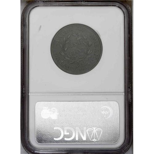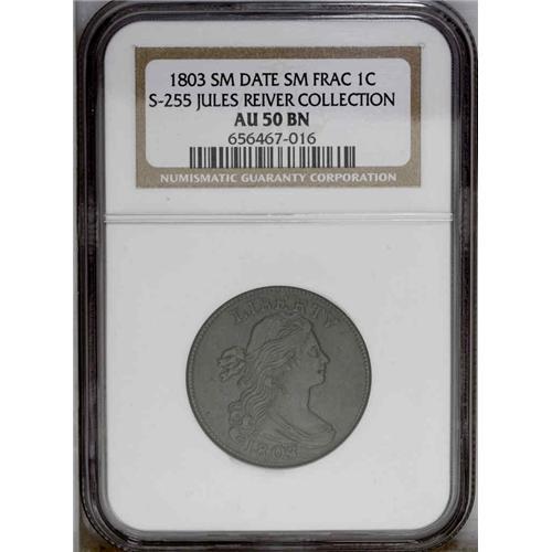 <B>1803<1C> Small Date, Small Fraction. S-255, B-14, R.1. AU50 NGC. VF35 EAC.</B></I> Die State I. This variety's obverse has the 3 in the date low and leaning right. The right foot of R and both feet of Y are broken. The reverse fraction bar is long and slants upward to the right. This lovely, glossy example is a pleasing olive-brown, well struck and well centered. It shows excellent detailing, including a clear delineation of Liberty's head and hair all along her forehead and down her cheek. Faint die clash marks show under her chin, with heavier die clash marks under the hair ribbon. Examination under a glass reveals only microscopic roughness scattered here and there, invisible to the naked eye, along with a couple of small ticks unworthy of individual mention. No sign shows of the faint die crack that would later connect ER in AMERICA. The reverse die is rotated counterclockwise about 30 degrees. This piece approaches Del Bland's expanded Condition Census of nine S-255 coins in Walter Breen's large cent <I>Encyclopedia,</B></I> which ranges from MS61 to AU55.<BR><I> Ex: Bruno Crossfield (12/1956); Willard C. Blaisdell (2/8/1971).</B></I>Envelope Included.