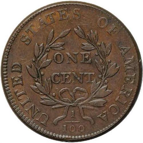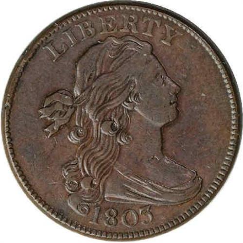 <B>1803<1C> Small Date, Small Fraction. S-256, B-15, R.3. AU55 NGC. VF35 EAC.</B></I> Die State III. Clash marks are visible above Liberty's hair ribbon. A light obverse crack emerges from the rim to intersect the 8, arcing right through the drapery and the bustline before rejoining the rim. The last segment of this crack is faint on the present specimen. A reverse crack runs from the rim through D, upward along the left center wreath stem, intersecting the lower serif of E to rejoin the rim between E and S. A long, straight die line connects the right stem end with the last A. This coin offers lustrous, milk-chocolate surfaces with a bit of tan color at STATES. The surfaces are smooth and attractive, excepting only what appears to be a small, jagged as-made planchet flaw, about the width of the forecurl, on Miss Liberty's neck. The strike is a bit weak at OF and on Liberty's highpoint hair curls, but there is excellent separation overall on the hair strands, the drapery, and the wreath. This coin ranks in the high end of the Condition Census, namely fourth finest, as presented in Breen's large cent <I>Encyclopedia,</B></I> which records 12 coins ranging from MS63 to XF40.<BR><I> Ex: R. Green (Chicago, 12/3/1958); John A. Schreuder; Del Bland (5/27/1970).</B></I> Envelope Included.