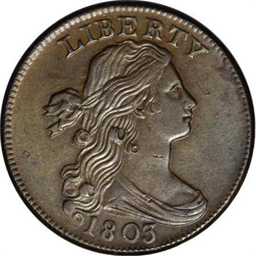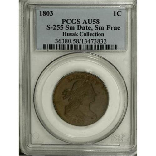 <B>1803 1C Small Date, Small Fraction. AU58 PCGS. S-255, B-14, R.1. </B></I> <B>Noyes AU50; tied for CC-5. Photo #37560. Our EAC Grade AU55.<BR><BR>Equivalents. </B></I>Proskey 9; Doughty 187; McGirk 7A; Ross 9; Newcomb 13; EAC 14; <I>Encyclopedia </B></I>1754; PCGS #1482.<BR><B><BR>Variety. </B></I>Small Date. Wide date, 03 close, 3 low and leans right. Small Fraction. Fraction bar long, slants up to right. The obverse appears on S-255. The reverse appears on S-254 and S-255.<BR><B><BR>Surfaces. </B></I>Intermingled olive and tan with hints of faded red on the reverse. The obverse has dark stains near the border at 2 o'clock and on the drapery at 5 o'clock. A small nick on Liberty's neck is just left of the center of the neckline.<BR><BR><B>Die State III. </B></I>The reverse has a crack at the tops of ST. A later state is known with a rim break there.<BR><BR><B>Census. </B></I>This example is unlisted in Bland's abbreviated Census, although called fifth finest by Noyes. Bland lists four Mint State coins and five AU55 pieces in his roster of nine coins. Our EAC grade would place it in a tie for fifth finest known in Bland's list, exactly where it is recorded in the Noyes Census.<BR><BR><B>Commentary. </B></I>Sheldon-255 ranks among the common varieties of the date, called third commonest in <I>Penny Whimsy</B></I>. Today, only S-254, 255, 258, and 260 are considered Rarity-1 issues, so this die marriage is at the most, fourth commonest. Experience suggests that S-260 is the commonest 1803, followed by S-258, S-255, and S-254.<BR><BR><B>Provenance. </B></I><I>W.M. "Jack" Wadlington; Chris Victor-McCawley.</B></I><BR><BR><b>Shipping:</b> Coins & Currency (<a target="_blank" href="http://www.heritageauctions.com/common/shipping.php">view shipping information</a>)