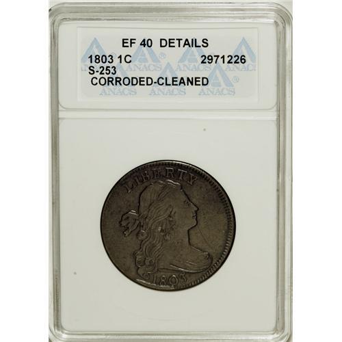 <B>1803 1C Small Date, Small Fraction--Corroded, Cleaned--ANACS. XF40 Details.</B></I> S-253, B-12, R.2. Breen Die State VI with a prominent obverse cud between 6 and 7 o'clock. The obverse die is misaligned toward 9 o'clock. This terminal die state is considered very rare. This bold but mildly granular piece may have been lightly burnished, and the obverse has a few hairlines in addition to a solitary pinscratch beneath the chin. EAC 20.<BR><BR><b>Shipping:</b> Coins & Currency (<a target="_blank" href="http://www.heritageauctions.com/common/shipping.php">view shipping information</a>)