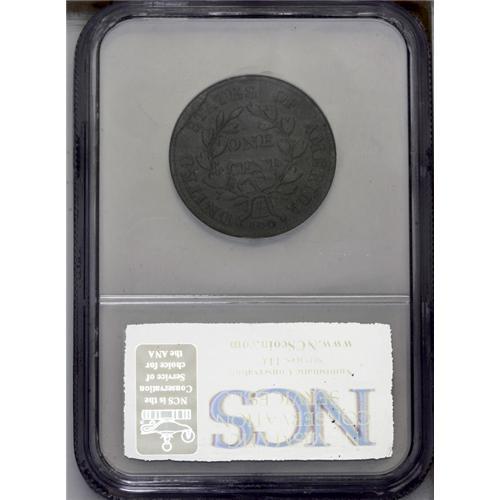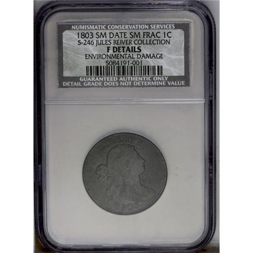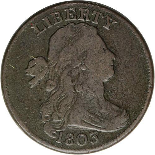 <B>1803<1C> Small Date, Small Fraction. S-246, B-4, High R.3--Environmental Damage--NCS. Fine Details. VG8 EAC.</B></I> Die State IV. This coin would make a pleasing "bookends" set with the earliest die state of this, the "mumps" variety. Here the lump at the base of Liberty's throat is highly pronounced, if not quite "horizontal," to use Breen's term. The reverse die break is large and runs along the rim from one letter space left of STA almost to the second T, actually touching the tops of STA. Both sides show extensive evidence of die clashing. What apparently looked like environmental damage to NCS is planchet corrosion, mostly microscopic and not really noticeable without a glass. The dark brown surfaces, to the unaided eye, are fairly pleasing and show an interesting level of detail with all the die clashes in evidence. A small obverse rim nick at 3 o'clock is noted for accuracy.<BR><I> Ex: Denis Loring; Gordon Wrubel (3/20/1974).</B></I> Envelope Included.