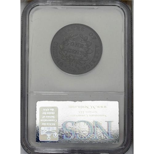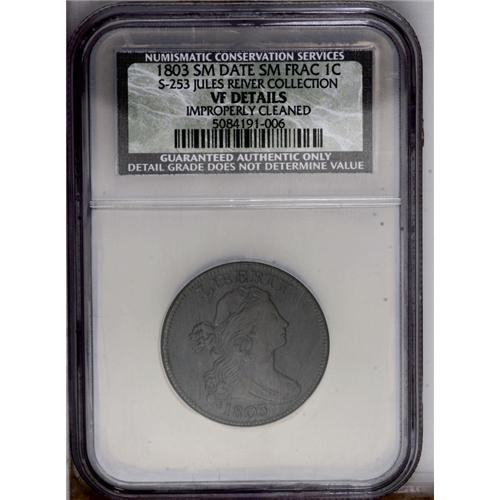 <B>1803<1C> Small Date, Small Fraction. S-253, B-12, High R.2--Improperly Cleaned--NCS. VF Details. VF20 EAC.</B></I> Die State V. This coin is from the later stages of this die state. The most prominent reverse die crack, at STAT, is heavy enough to cause two planes to the coin, the lower plane nearer the rim. A second crack issues from between D and S to join the wreath, another from the top of the D to join the second nearby, and numerous interesting clash marks are clearly visible, including four distinct sets from the front of Liberty's bust just beneath the F. There is a light die chip at the upper portion of the D. This specimen has a clean, olive-brown planchet that reveals no mentionable distractions under magnification.<BR><I> Ex: George Ramont (3/21/1972).</B></I> Envelope Included.