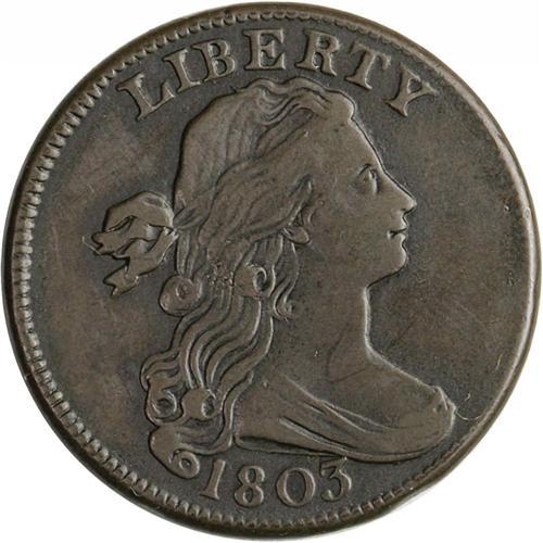 <B>1803<1C> Small Date, Small Fraction. S-254, B-13, R.2--Improperly Cleaned--NCS. VF Details. VF20 EAC.</B></I> Die State I. IB are close and the 3 in the date touches the drapery on this variety's obverse, while the reverse has a long fraction bar that slants upward to the right. No obverse cracks or clash marks evident. Reverse clash marks are most obvious from the fraction to the right ribbon and last A. Other faint clash marks are visible within the wreath. The coin has smooth surfaces, medium brown on the obverse and a bit darker on the reverse. The borders and dentilation are thinner and weak on the left sides. A couple of trivial rough areas on the reverse reveal themselves under a glass, with no further distractions noted.<BR><I> Ex: French; George Ramont (3/29/1971).</B></I> Envelope Included.