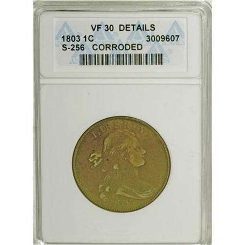 <B>1803 1C Small Date, Small Fraction--Corroded--ANACS. VF30 Details.</B></I> S-256. NGC Census: (13/196). PCGS Population (27/165). Mintage: 3,131,691. Numismedia Wsl. Price for NGC/PCGS coin in VF30: $400. (#1482)<BR><BR><B>Coin Engraver:</B> Robert Scot<BR><BR><b>Shipping:</b> Coins & Currency (<a target="_blank" href="http://www.heritageauctions.com/common/shipping.php">view shipping information</a>)