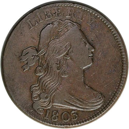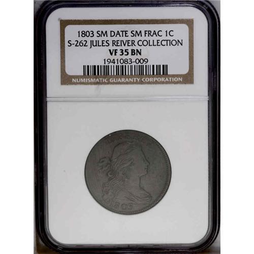 <B>1803<1C> Small Date, Small Fraction. S-262, B-21, Low R.4. VF35 NGC. VF25 EAC.</B></I> Die State II. This variety's obverse diagnostic is the divided date, spaced 18 03. Two die cuts, across the drapery and in the lower right obverse field, are almost always present as well. In this die state a long, straight crack runs down from near the neck, crosses the bust, and terminates in the drapery. This glossy example is medium-brown with some faint contact marks. Appealing for the grade.<BR><I>Ex: Wattenbarger (9/1/1968).</B></I> Envelope Included.