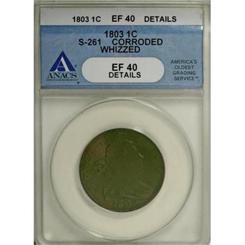 <B>1803 1C Small Date, Small Fraction--Corroded, Whizzed--ANACS. XF40 Details. </B></I>S-261. NGC<B> </B></I>Census: (22/154). PCGS Population (27/118). Mintage: 3,131,691. Numismedia Wsl. Price for NGC/PCGS coin in XF40: $625. (#1482)<BR><BR><B>Coin Engraver:</B> Robert Scot<BR><BR><b>Shipping:</b> Coins & Currency (<a target="_blank" href="http://www.heritageauctions.com/common/shipping.php">view shipping information</a>)