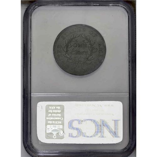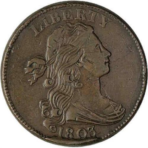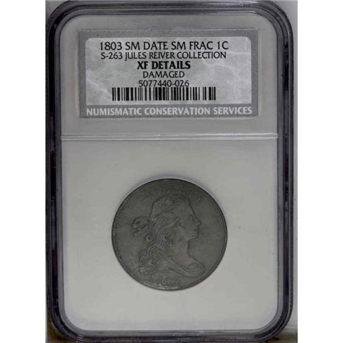<B>1803<1C> Small Date, Small Fraction. S-263, B-22, R.3--Damaged--NCS. XF Details. VF20 EAC.</B></I> Die State VI. Apparently early in this die state. A heavy rim break on 1803 extends beneath the lowest curl. A reverse crack leads from the rim between D and S, through the wreath, top leaves, along the O in OF, and back to the rim, this break light despite Breen's description. A light crack extends from the 3 to the drapery, but there is no sign of bulging at STA. This coin's damage appears as a straight scrape across Liberty's curls near the juncture of the neck and gown, a pit on her neck, another on the shoulder, several smaller digs on her cheek and higher hair curls, and some light digs in the reverse center. There are also a couple of small rim bumps. None of these are overly prominent, however, and the coin presents a pleasing level of detail remaining.<BR><I>Ex: Del Bland (7/19/1969).</B></I> Envelope Included.