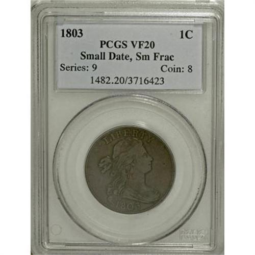 <B>1803 1C Small Date, Small Fraction VF20 PCGS.</B></I> S-247, B-5, R.3. A die clash of denticles through the fraction denominator aids attribution. Liberty has a mint-made lump under the chin. This dark brown example has lighter highpoints and ample hair detail. Mildly granular with a thin mark down from the Y in LIBERTY. EAC 12.<BR><BR><B>Coin Engraver:</B> Robert Scot<BR><BR><b>Shipping:</b> Coins & Currency (<a target="_blank" href="http://www.heritageauctions.com/common/shipping.php">view shipping information</a>)