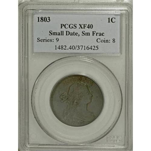 <B>1803 1C Small Date, Small Fraction XF40 PCGS.</B></I> S-253, B-12, R.2. A boldly defined gunmetal-gray cent that displays satin luster within Liberty's hair. Thorough study locates a couple of minor marks and spots. EAC 25.<BR><BR><B>Coin Engraver:</B> Robert Scot<BR><BR><b>Shipping:</b> Coins & Currency (<a target="_blank" href="http://www.heritageauctions.com/common/shipping.php">view shipping information</a>)