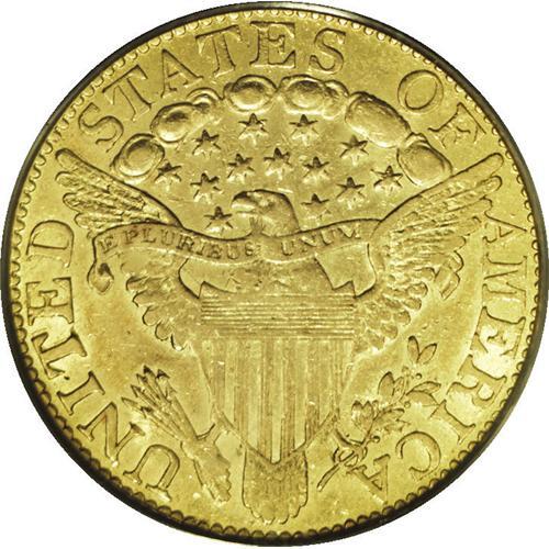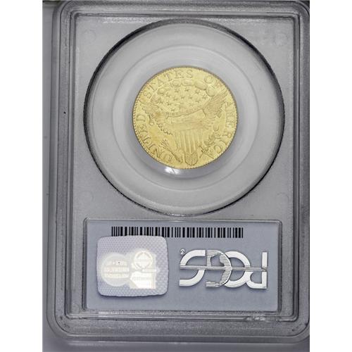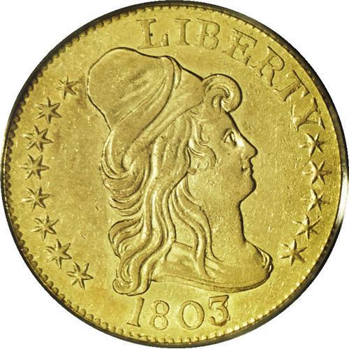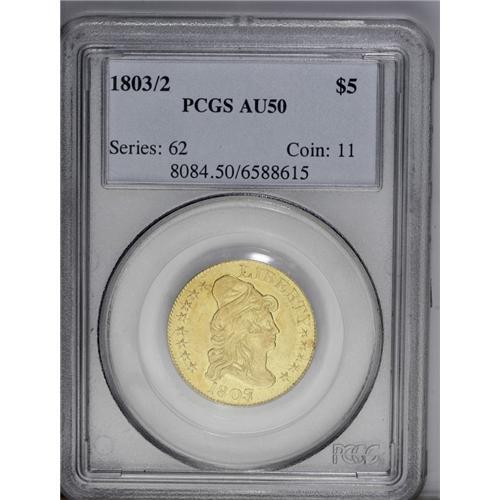 <B>1803/2 $5 AU50 PCGS.</B></I> Breen-6441, BD-3, R.4. BD-3 is distinguished by defective T and Y punches, each of which is missing a foot. The T in UNITED is widely repunched, but the initial impression has a right foot, while the second, bolder T does not. Perhaps the T punch broke while repunching this very letter. This partly lustrous representative is pleasantly void of visible marks, and the honey-gold toning appears original.<BR><I>From The Jones Beach Collection.</B></I><BR><BR><b>Shipping:</b> Coin/Currency (<a target="_blank" href="http://www.heritageauctions.com/common/shipping.php">view shipping information</a>)