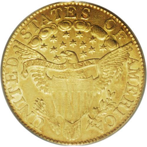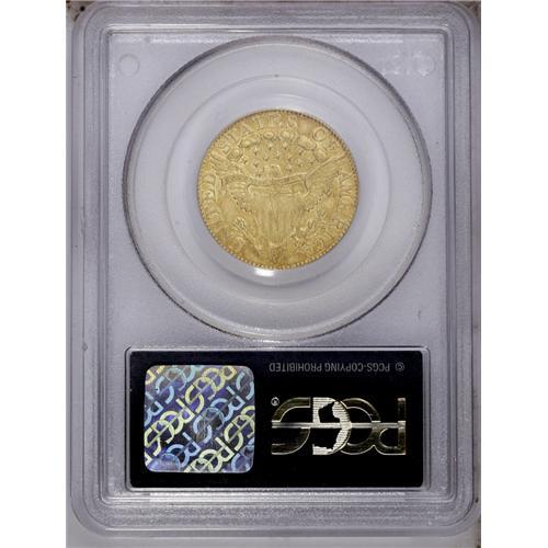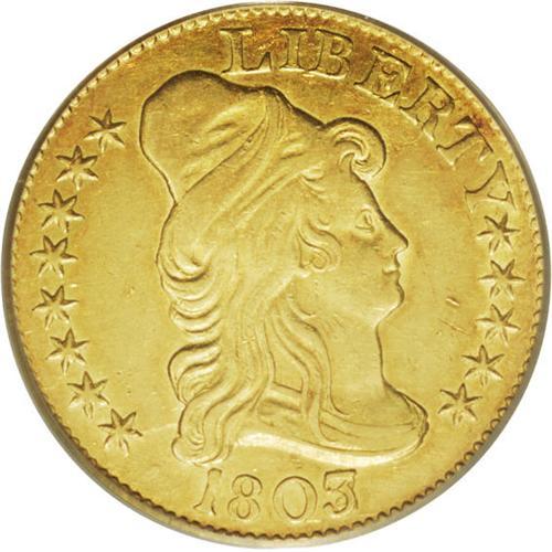 <B>1803/2<$5> AU50 PCGS.</B></I> Breen-6441, B. 1-C, Miller-56, R.4. Four varieties of the 1803 half eagle are known, all of which have the 3 in the date punched over a 2. This one is easily identifiable with a thin die crack through the TED of UNITED, and a missing right foot on the T and the left foot of the Y of LIBERTY. The portrait has light rub on the cheek, brow, and cap, but abundant luster outlines the date, stars, and hair tresses. Generally sharp, with portions of the shield and claws not fully struck. The obverse has an abrasion in the right field, and several gouges are seen at the center of the reverse, however the coin has an attractive and original reddish-golden appearance.