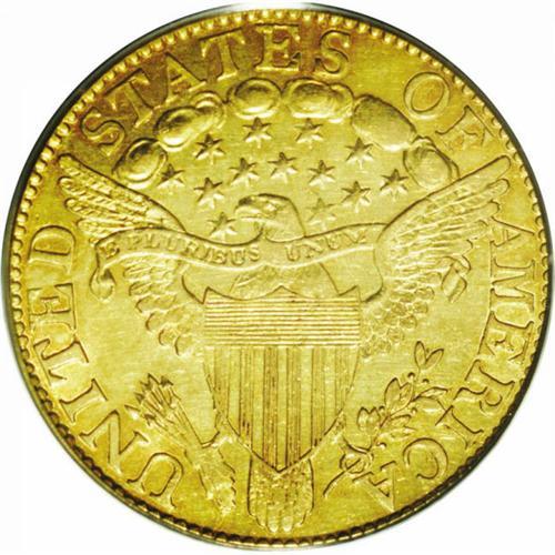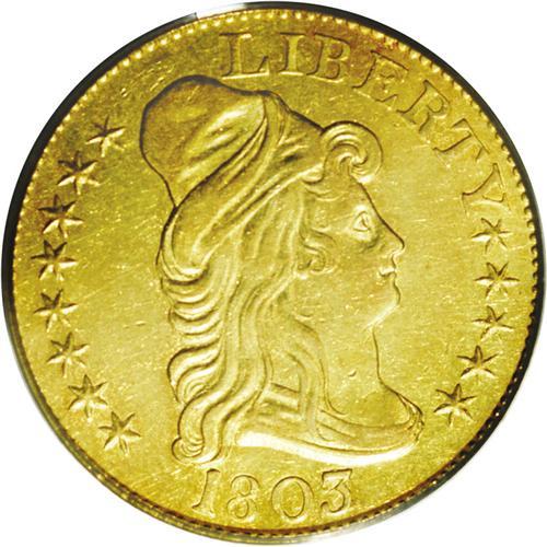 <B>1803/2<$5> AU50 PCGS.</B></I> Breen-6441, B. 1-D, Miller-57, R.4. All 1803 half eagles are 1803/2 overdates, but they were coined from two different overdate obverse dies. This obverse, which is the long-recognized obverse die for the year, has the right base of T and left base of Y missing. The other obverse has the right base of T complete, and is always seen with a heavy die crack through the base of the date. When it was first discovered (technically rediscovered as W. Elliot Woodward discussed two overdate obverses in the 1860s), it was thought that the second obverse constituted a rare variety, although now we understand that all 1803/2 varieties are equally common. A pleasing light green-gold example with hints of orange toning near the borders. The fields are reflective, and light abrasions are noted on both sides. Housed in an older green-label holder.