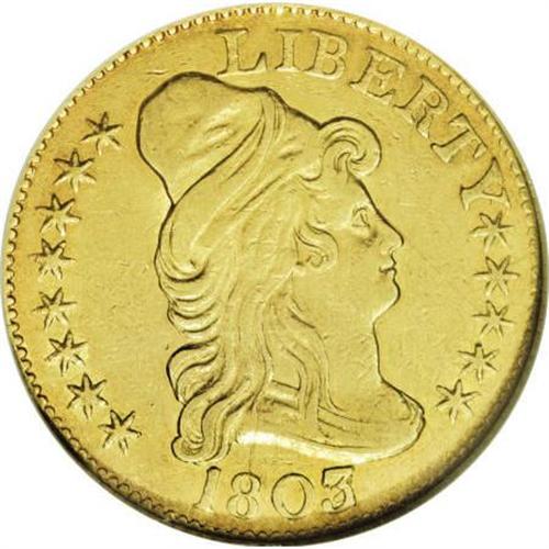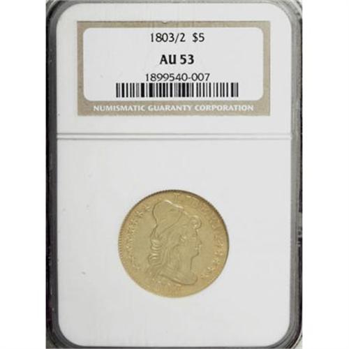 <B>1803/2 $5 AU53 NGC.</B></I> Breen-6441, BD-2, R.5. The late die state with a bisecting die crack on the reverse between the U in UNITED and the E in STATES. A lovely example of this difficult die marriage, identified by the position of the upright of the E in STATES. The bust shows light highpoint wear, but the eagle shows nearly full detail, and luster enlightens the legends and devices.<BR><BR><B>Coin Engraver:</B> Robert Scot<BR><BR><b>Shipping:</b> Coins & Currency (<a target="_blank" href="http://www.heritageauctions.com/common/shipping.php">view shipping information</a>)