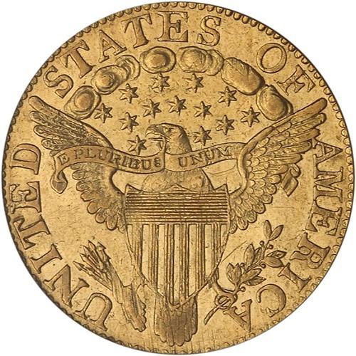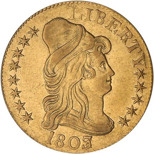 Mintage of this coin is 33,506 coins. For the date and grade, a reasonably frosty, light golden example with decent luster on both sides. Attractively struck as well, with just a hint of softness at the complex areas of the reverse. Most probably, the early half eagles like this 1803, once they were distributed to the respective depositors, were retained by foreign banks and other depositories. After June 28, 1834, when the American gold coin specifications were changed and the authorized weights of gold coins changed, nearly all earlier American gold coins were rounded up and melted, as relying upon their face value was no longer a valid way for foreign holders to evaluate them, in light of new-weight gold coins produced on and after August 1, 1834 (the date of implementation of the Act of June 28, 1834).