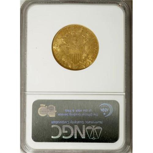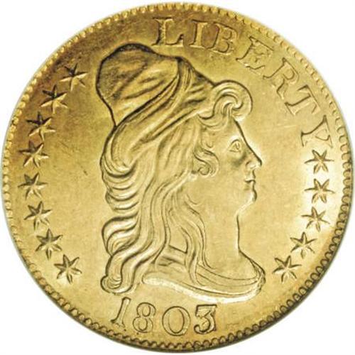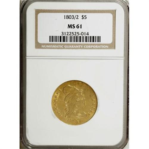 <B>1803/2 $5 MS61 NGC.</B></I> Breen-6441, BD-2, R.5. The right foot of T in LIBERTY is missing, as are the feet of all three Ts on the reverse. Key diagnostics are on the reverse, as the obverse dies were also used on BD-1 and BD-3. These include a star well away from the beak, and the upright of E in STATES over a cloud space. <BR>These important comments were made by John Dannreuther in <I>Early U.S. Gold Coin Varieties </B></I>(2006): "This is the scarcest variety of 1803, although it has not been widely recognized as such, as the misidentification of Obverse 2 used for this year has muddled the census of the next two varieties."<BR>This example is boldly struck and lustrous, with lovely, rich tones of apricot, orange-gold, and lime. A noticeable die crack extends from near 12 o'clock on the upper reverse rim, down through E in STATES, through the eagle's beak, and all the way to the lower left rim near 7 o'clock, just to the side of the U in UNITED. A few small marks and some wispy obverse hairlines limit the grade of this otherwise pleasing example.<BR><BR><BR> <BR><BR><B>Coin Engraver:</B> Robert Scot<BR><BR><b>Shipping:</b> Coins & Currency (<a target="_blank" href="http://www.heritageauctions.com/common/shipping.php">view shipping information</a>)
