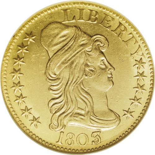 <B>1803/2 $5 MS62 NGC.</B></I> Breen-6441, BD-4, R.4. There are four die marriages of 1803/2 half eagles, but BD-4 is immediately identified by the presence of a right foot on the T in LIBERTY. The left foot on the Y is defective, but this cannot be used as a diagnostic, since the other obverse die (for BD-1 through BD-3) shows this same characteristic. This yellow-gold example is well struck aside from the left border of the shield. The reverse is fully lustrous, and the fields show only minor contact. A solitary faint vertical mark on the cheek can only be seen beneath a loupe. A desirable example of this elusive Heraldic Eagle date. Census: 45 in 62, 54 finer (10/06).<BR><BR><b>Shipping:</b> Coin/Currency (<a target="_blank" href="http://www.heritageauctions.com/common/shipping.php">view shipping information</a>)