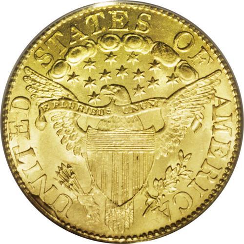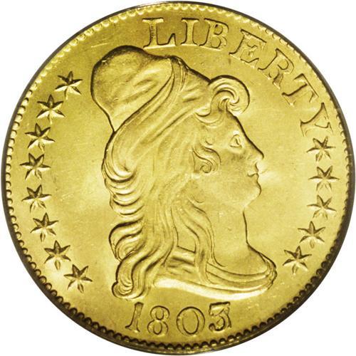 <B>1803/2 $5 MS65 PCGS.</B></I> Breen-6441, BD-1, R.4. A fully lustrous Gem that ranks among the finest 1803/2 half eagles. The strike is exacting save for the eagle's left (facing) claw, which is opposite the comparatively high relief cap. The light canary-gold surfaces lack identifying abrasions, and a slender diagonal roller mark (as made) on the left half of the shield provides the only suitable pedigree marker. It is unlikely that <I>any</B></I> 1803/2 half eagle of similar quality will appear at auction for some time, let alone an example of BD-1 with a cud die break.<BR> All 1803 half eagles are overdates. Two obverse dies were used, and both show prominent remnants of an underdigit 2. BD-1 shares its obverse die with two other varieties, so it is identified by its reverse. An arrowhead is centered beneath the N in UNITED, rather than beneath the right upright of the N, as is the case for BD-2 to BD-4. Most if not all examples of BD-1 exhibit a die crack through TED. Later, slender die cracks emerge along the left shield border and the left curve of the O in OF. The present piece is from the final die state, noted for a cud over the UN in UNITED. A brief survey of Heritage's Permanent Auction Archives failed to locate another example of BD-1 with this cud, and the variety is probably very rare as such. Harry W. Bass, Jr. was likely the first to note this die state; a polished example appears as lot 307 in the Bass IV auction. Bass was blessed with the resources to collect early gold not only by die marriage, but by die state, and his fastidious notes are an invaluable resource for researchers. Encapsulated in a green label PCGS holder. Population: 2 in 65, 2 finer (10/06).<BR><I>From The Essex Palm Collection.</B></I><BR><BR><b>Shipping:</b> Coin/Currency (<a target="_blank" href="http://www.heritageauctions.com/common/shipping.php">view shipping information</a>)