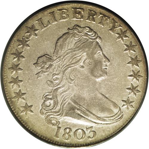 <B>1803<50C> Large 3 AU50 PCGS.</B></I> O-103, R.3. This boldly struck Draped Bust half displays generous selections of its original luster. The pearl-gray surfaces are attractively unmarked, aside from a couple of unimportant abrasions on the upper right obverse field. Housed in a green label holder. Population: 20 in 50, 27 finer (5/06).<BR><I>From The Royal Oak Collection.</B></I>