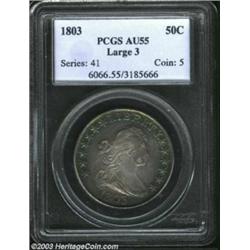 <TABLE cellSpacing=0 cellPadding=0 width="100%" bgColor=#000000 border=0><TBODY><TR><TD width="100%"><TABLE cellSpacing=1 cellPadding=3 width="100%" border=0><TBODY><TR><TD width="100%" bgColor=#79735c><FONT face=arial color=#ffffff size=3><B>Description</B> </FONT></TD></TR><TR><TD width="100%" bgColor=#ffffff><FONT face=arial size=2><B>1803 50C Large 3 AU55 PCGS.</B></I> O-103, R.3. Generally well struck and toned in rich turquoise and violet shades. This appealing example easily qualifies for Condition Census status, with a rather tight spread of listings in Overton from a low of XF45 to a high of AU50. </FONT></TD></TR></TBODY></TABLE></TD></TR></TBODY></TABLE><BR><A name=PricesRealized></A><TABLE cellSpacing=0 cellPadding=0 width="100%" bgColor=#000000 border=0><TBODY><TR><TD width="100%"><TABLE cellSpacing=1 cellPadding=3 width="100%" border=0><TBODY><TR><TD width="100%" bgColor=#79735c><A name=PR><FONT face=arial color=#ffffff size=3><B>Previous Prices from Heritage Auctions</B> </FONT></A></TD></TR><TR><TD bgColor=#f6f6ed><TABLE cellSpacing=0 cellPadding=0 width="100%" border=1><TBODY><TR><TD align=middle width="33%"><B>Date</B></TD><TD align=middle width="33%"><B>Service</B></TD><TD align=middle width="33%"><B>Price</B></TD></TR><TR bgColor=whitesmoke><TD width="33%"><B>05/03/2003</B></TD><TD width="33%">PCGS</TD><TD width="33%">$4,025.00</TD></TR><TR bgColor=whitesmoke><TD width="33%"><B>01/01/1996</B></TD><TD width="33%">PCGS</TD><TD width="33%">$2,970.00</TD></TR><TR bgColor=whitesmoke><TD width="33%"><B>11/01/1999</B></TD><TD width="33%">NGC</TD><TD width="33%">$1,495.00</TD></TR></TBODY></TABLE></TD></TR><TR><TD bgColor=#ffffff><FONT face=arial size=1 ?>PLEASE NOTE: All prices realized reflect the final hammer price PLUS the buyer's premium in auctions that charge a buyer's premium. Each item has a notation at the top of the listing indicating whether that lot included a buyer's premium. Example: A item that sells with a final hammer price of $100 and a 20% buyer's premium will display with a price realized of $120. All information listed is intended to be as accurate as possible, but errors are possible. Please use this guide carefully and inform us of any inaccuracies. </FONT></TD></TR></TBODY></TABLE></TD></TR></TBODY></TABLE><BR><TABLE cellSpacing=0 cellPadding=0 width="100%" bgColor=#000000 border=0><TBODY><TR><TD width="100%"><TABLE cellSpacing=1 cellPadding=3 width="100%" border=0><TBODY><TR><TD width="100%" bgColor=#79735c colSpan=6><FONT face=arial color=#ffffff size=3><B>Price Guide*</B> </FONT></TD></TR><TR bgColor=#f6f6ed><TD align=middle><B>Grade</B> </TD><TD align=middle><B>Coin World<BR>(Trends)</B> </TD><TD align=middle><B>Numismedia<BR>Retail</B> </TD><TD align=middle><B>Numismedia<BR>Wholesale</B> </TD><TD align=middle><B>Coin<BR>Universe</B> </TD><TD align=middle><B>Heritage<BR>Value Index</B> </TD></TR><TR bgColor=#ffffff><TD align=middle>53</TD><TD align=right>---</TD><TD align=right>---</TD><TD align=right>---</TD><TD align=right>---</TD><TD align=right>$2,087.21</TD></TR><TR style="FONT-WEIGHT: bold" bgColor=#cccfdd><TD align=middle>55</TD><TD align=right>$3,600.00</TD><TD align=right>---</TD><TD align=right>---</TD><TD align=right>$2,475.00</TD><TD align=right>$2,407.50</TD></TR><TR bgColor=#ffffff><TD align=middle>58</TD><TD align=right>---</TD><TD align=right>---</TD><TD align=right>---</TD><TD align=right>---</TD><TD align=right>$3,627.00</TD></TR><TR bgColor=#ffffff><TD colSpan=6><FONT size=1>*All information listed is intended to be as accurate as possible, but errors are possible. No item may be returned or refused based on this information which is provided as a service to our customers. You should contact each pricing source directly to determine the accuracy of this information. </FONT></TD></TR></TBODY></TABLE></TD></TR></TBODY></TABLE><BR><TABLE cellSpacing=0 cellPadding=0 width="100%" bgColor=#000000 border=0><TBODY><TR><TD width="100%"><TABLE cellSpacing=1 cellPadding=3 width="100%" border=0><TBODY><TR><TD width="100%" bgColor=#79735c><FONT face=arial color=#ffffff size=3><B>Population Guide</B> </FONT></TD></TR><TR bgColor=#ffffff><TD align=middle><!-- Begin Output of Population Grid--><TABLE cellSpacing=0 cellPadding=0 width="100%" border=0><TBODY><TR><TD vAlign=center><TABLE cellSpacing=0 width="100%" border=1 cellsadding="3"><TBODY><TR><TD vAlign=center><TABLE cellSpacing=0 cellPadding=3 width="100%" border=1><TBODY><TR><TD vAlign=center align=middle bgColor=#f0f1e8 colSpan=2 <CENTER><FONT face=Arial size=2><B>PCGS Pop </B></FONT><CENTER></CENTER></TD><TD vAlign=center align=middle bgColor=#f0f1e8 colSpan=2><CENTER><FONT face=Arial size=2><B>NGC Pop</B></CENTER></FONT></TD></TR><TR><TD vAlign=center><FONT face=Arial size=2>(55)</FONT> </TD><TD vAlign=center align=right><FONT face=Arial size=2>12</FONT> </TD><TD vAlign=center><FONT face=Arial size=2>(55)</FONT> </TD><TD vAlign=center align=right><FONT face=Arial size=2>7</FONT> </TD></TR><TR><TD vAlign=center><FONT face=Arial size=2>(>55)</FONT> </TD><TD vAlign=center align=right><FONT face=Arial size=2>5</FONT> </TD><TD vAlign=center><FONT face=Arial size=2>(>55)</FONT> </TD><TD vAlign=center align=right><FONT face=Arial size=2>15</FONT> </TD></TR></TBODY></TABLE></TD></TR></TBODY></TABLE></TD></TR></TBODY></TABLE><!-- End Output of Population Grid--> Important notice: Heritage usually auctions material at the rate of 200-250 lots per hour. On some occasions eBay Live bid software or the Internet may not be able to keep up with the pace of the auction. We recommend placing a realistic absentee bid now as insurance to avoid disappointment. Occasionally the auctioneer may eliminate or reject an eBay Live bid, and the auctioneer may also reopen a lot after the close of the eBay live bidding (usually because we missed an audience bid), and may reject your bid even if it shows you as the winning bidder. By bidding via eBay Live, you agree that Heritage may award the lot to another bidder 