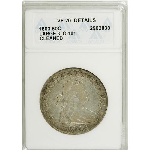 <B>1803 50C Large 3--Cleaned--ANACS. VF20 Details.</B></I> O-101. NGC Census: (77/293). PCGS Population (26/199). Mintage: 188,234. Numismedia Wsl. Price: $360. (#6066)<BR><BR><b>Shipping:</b> Coins & Currency (<a target="_blank" href="http://www.heritageauctions.com/common/shipping.php">view shipping information</a>)