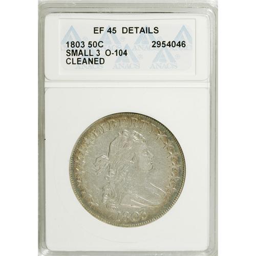 <B>1803 50C Small-3--Cleaned--ANACS. XF45 Details.</B></I> O-104 NGC Census: (52/53). PCGS Population (27/42). Mintage: 188,234. Numismedia Wsl. Price: $1,726. (#6066)<BR><BR><b>Shipping:</b> Coins & Currency (<a target="_blank" href="http://www.heritageauctions.com/common/shipping.php">view shipping information</a>)