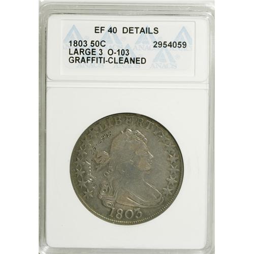 <B>1803 50C Large 3--Cleaned, Graffiti--ANACS. XF40 Details.</B></I> O-103. NGC Census: (34/105). PCGS Population (32/69). Mintage: 188,234. Numismedia Wsl. Price: $1,175. (#6066)<BR><BR><b>Shipping:</b> Coins & Currency (<a target="_blank" href="http://www.heritageauctions.com/common/shipping.php">view shipping information</a>)