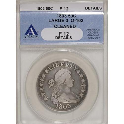 <B>1803 50C Large 3--Cleaned--ANACS. F12 Details.</B></I> O-102. NGC Census: (8/242). PCGS Population (17/274). Mintage: 188,234. Numismedia Wsl. Price for NGC/PCGS coin in F12: $275. (#6066)<BR><BR><B>Coin Engraver:</B> Robert Scot<BR><BR><b>Shipping:</b> Coins & Currency (<a target="_blank" href="http://www.heritageauctions.com/common/shipping.php">view shipping information</a>)