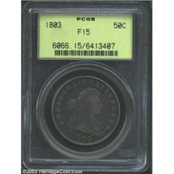 <TABLE cellSpacing=0 cellPadding=0 width="100%" bgColor=#000000 border=0><TBODY><TR><TD width="100%"><TABLE cellSpacing=1 cellPadding=3 width="100%" border=0><TBODY><TR><TD width="100%" bgColor=#79735c><FONT face=arial color=#ffffff size=3><B>Description</B> </FONT></TD></TR><TR><TD width="100%" bgColor=#ffffff><FONT face=arial size=2><B>1803 50C Large 3 Fine 15 PCGS.</B></I> O-103, R.3. A deeply toned piece with a fully legible motto and sharp plumage definition for the grade. Traces of verdigris, but refreshingly unabraded. Liberty's ear has clashmarks (as made) from the reverse shield. </FONT></TD></TR></TBODY></TABLE></TD></TR></TBODY></TABLE><BR><A name=PricesRealized></A><TABLE cellSpacing=0 cellPadding=0 width="100%" bgColor=#000000 border=0><TBODY><TR><TD width="100%"><TABLE cellSpacing=1 cellPadding=3 width="100%" border=0><TBODY><TR><TD width="100%" bgColor=#79735c><A name=PR><FONT face=arial color=#ffffff size=3><B>Previous Prices from Heritage Auctions</B> </FONT></A></TD></TR><TR><TD bgColor=#f6f6ed><TABLE cellSpacing=0 cellPadding=0 width="100%" border=1><TBODY><TR><TD align=middle width="33%"><B>Date</B></TD><TD align=middle width="33%"><B>Service</B></TD><TD align=middle width="33%"><B>Price</B></TD></TR><TR bgColor=whitesmoke><TD width="33%"><B>07/30/2002</B></TD><TD width="33%">NGC</TD><TD width="33%">$310.50</TD></TR><TR bgColor=whitesmoke><TD width="33%"><B>07/25/2000</B></TD><TD width="33%">NGC</TD><TD width="33%">$230.00</TD></TR><TR bgColor=whitesmoke><TD width="33%"><B>05/05/2003</B></TD><TD width="33%">PCGS</TD><TD width="33%">$552.00</TD></TR></TBODY></TABLE></TD></TR><TR><TD bgColor=#ffffff><FONT face=arial size=1 ?>PLEASE NOTE: All prices realized reflect the final hammer price PLUS the buyer's premium in auctions that charge a buyer's premium. Each item has a notation at the top of the listing indicating whether that lot included a buyer's premium. Example: A item that sells with a final hammer price of $100 and a 20% buyer's premium will display with a price realized of $120. All information listed is intended to be as accurate as possible, but errors are possible. Please use this guide carefully and inform us of any inaccuracies. </FONT></TD></TR></TBODY></TABLE></TD></TR></TBODY></TABLE><BR><TABLE cellSpacing=0 cellPadding=0 width="100%" bgColor=#000000 border=0><TBODY><TR><TD width="100%"><TABLE cellSpacing=1 cellPadding=3 width="100%" border=0><TBODY><TR><TD width="100%" bgColor=#79735c colSpan=6><FONT face=arial color=#ffffff size=3><B>Price Guide*</B> </FONT></TD></TR><TR bgColor=#f6f6ed><TD align=middle><B>Grade</B> </TD><TD align=middle><B>Coin World<BR>(Trends)</B> </TD><TD align=middle><B>Numismedia<BR>Retail</B> </TD><TD align=middle><B>Numismedia<BR>Wholesale</B> </TD><TD align=middle><B>Coin<BR>Universe</B> </TD><TD align=middle><B>Heritage<BR>Value Index</B> </TD></TR><TR bgColor=#ffffff><TD align=middle>12</TD><TD align=right>$235.00</TD><TD align=right>---</TD><TD align=right>---</TD><TD align=right>$275.00</TD><TD align=right>$182.38</TD></TR><TR style="FONT-WEIGHT: bold" bgColor=#cccfdd><TD align=middle>15</TD><TD align=right>---</TD><TD align=right>---</TD><TD align=right>---</TD><TD align=right>---</TD><TD align=right>$238.97</TD></TR><TR bgColor=#ffffff><TD align=middle>20</TD><TD align=right>$400.00</TD><TD align=right>---</TD><TD align=right>---</TD><TD align=right>---</TD><TD align=right>$293.38</TD></TR><TR bgColor=#ffffff><TD colSpan=6><FONT size=1>*All information listed is intended to be as accurate as possible, but errors are possible. No item may be returned or refused based on this information which is provided as a service to our customers. You should contact each pricing source directly to determine the accuracy of this information. </FONT></TD></TR></TBODY></TABLE></TD></TR></TBODY></TABLE><BR><TABLE cellSpacing=0 cellPadding=0 width="100%" bgColor=#000000 border=0><TBODY><TR><TD width="100%"><TABLE cellSpacing=1 cellPadding=3 width="100%" border=0><TBODY><TR><TD width="100%" bgColor=#79735c><FONT face=arial color=#ffffff size=3><B>Population Guide</B> </FONT></TD></TR><TR bgColor=#ffffff><TD align=middle><!-- Begin Output of Population Grid--><TABLE cellSpacing=0 cellPadding=0 width="100%" border=0><TBODY><TR><TD vAlign=center><TABLE cellSpacing=0 width="100%" border=1 cellsadding="3"><TBODY><TR><TD vAlign=center><TABLE cellSpacing=0 cellPadding=3 width="100%" border=1><TBODY><TR><TD vAlign=center align=middle bgColor=#f0f1e8 colSpan=2 <CENTER><FONT face=Arial size=2><B>PCGS Pop </B></FONT><CENTER></CENTER></TD><TD vAlign=center align=middle bgColor=#f0f1e8 colSpan=2><CENTER><FONT face=Arial size=2><B>NGC Pop</B></CENTER></FONT></TD></TR><TR><TD vAlign=center><FONT face=Arial size=2>(15)</FONT> </TD><TD vAlign=center align=right><FONT face=Arial size=2>24</FONT> </TD><TD vAlign=center><FONT face=Arial size=2>(15)</FONT> </TD><TD vAlign=center align=right><FONT face=Arial size=2>8</FONT> </TD></TR><TR><TD vAlign=center><FONT face=Arial size=2>(>15)</FONT> </TD><TD vAlign=center align=right><FONT face=Arial size=2>171</FONT> </TD><TD vAlign=center><FONT face=Arial size=2>(>15)</FONT> </TD><TD vAlign=center align=right><FONT face=Arial size=2>141</FONT> </TD></TR></TBODY></TABLE></TD></TR></TBODY></TABLE></TD></TR></TBODY></TABLE><!-- End Output of Population Grid--> Important notice: Heritage usually auctions material at the rate of 200-250 lots per hour. On some occasions eBay Live bid software or the Internet may not be able to keep up with the pace of the auction. We recommend placing a realistic absentee bid now as insurance to avoid disappointment. Occasionally the auctioneer may eliminate or reject an eBay Live bid, and the auctioneer may also reopen a lot after the close of the eBay live bidding (usually because we missed an audience bid), and may reject your bid even if it shows you as the winning bidder. By bidding via eBay Live, you agree that Heritage may award the lot to another bidder at its sole discretion under
