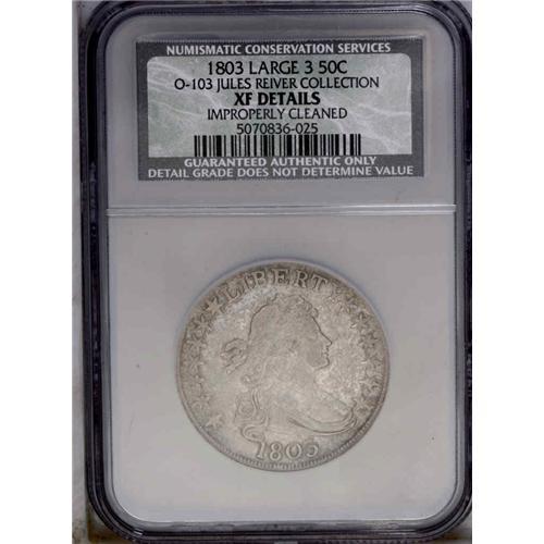 <B>1803<50C> Large 3. O-103, R.3--Improperly Cleaned--NCS. XF Details.</B></I> The obverse has a faint die crack through the tops of LIB and ERTY; a slightly later die state than the O-102a offered above, and indicative of the order of strike. Dappled silver-gray surfaces exhibit wispy hairlines from being lightly cleaned, which also resulted in a slightly metallic appearance. The motifs are nicely defined and well centered. A few minute abrasions are seen in the field near Liberty's forehead.<BR><I>Ex: George Ramont (12/1983).</B></I> Envelope Included.