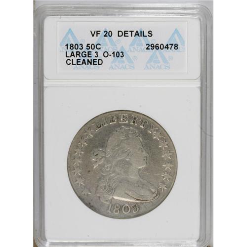 <B>1803 50C Large 3--Cleaned--ANACS. VF20 Details.</B></I> O-103. NGC Census: (77/293). PCGS Population (26/199). Mintage: 188,234. Numismedia Wsl. Price: $360. (#6066)<BR><BR><b>Shipping:</b> Coins & Currency (<a target="_blank" href="http://www.heritageauctions.com/common/shipping.php">view shipping information</a>)