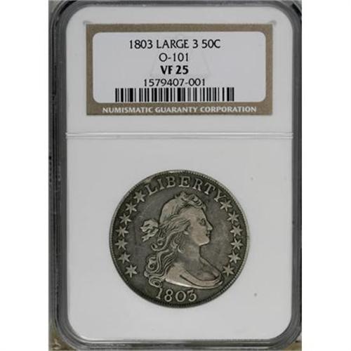<B>1803 50C Large 3 VF25 NGC.</B></I> O-101. NGC Census: (20/196). PCGS Population (38/177). Mintage: 188,234. Numismedia Wsl. Price for NGC/PCGS coin in VF25: $537. (#6066)<BR><BR><B>Coin Engraver:</B> Robert Scot<BR><BR><b>Shipping:</b> Coins & Currency (<a target="_blank" href="http://www.heritageauctions.com/common/shipping.php">view shipping information</a>)