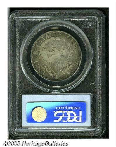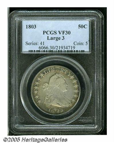 <B>1803<50C> Large 3 VF30 PCGS.</B></I> O-102a, R.3. The variety is confirmed by the eagle's beak being clear of the star, five berries on the branch, a short die line at the base of the D in UNITED, an irregular die crack that joins the TAT of STATES at the top, and another that runs through the ERICA of AMERICA. This specimen displays light gray surfaces and multicolored toning around the peripheries. A few minute marks are noted on Liberty's neck and chest.