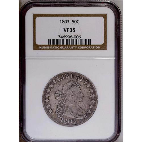 <B>1803<50C> Large 3 VF35 NGC.</B></I> O-101, R.3. A very nice, clean example of this type, showing only modest wear on the highpoints. The surfaces have toned a smooth gray color, with a few deeper accents at the borders, and all of the details are struck up very well. A few diagonal adjustment marks are seen at the center of the reverse.