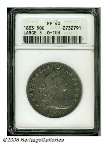 <B>1803<50C> Large 3 XF40 ANACS.</B></I> O-103, R.3. A splendidly detailed steel-gray Draped Bust Half Dollar. The strike is sharp aside from the uppermost pair of stars on the reverse. Moderate marks are noted on the tops of the clouds, the T in LIBERTY, and a few obverse stars.<BR><I>From The Empire State Collection, Part Two.</B></I>