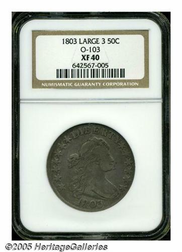 <B>1803<50C> Large 3 XF40 NGC.</B></I> O-103, R.3. Steel-violet surfaces, Evenly worn across the high points, especially the obverse, but free of serious contact marks.