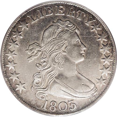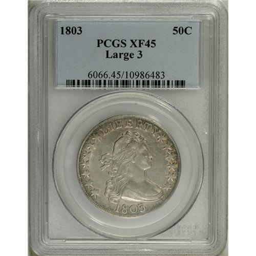 <B>1803 50C Large 3 XF45 PCGS.</B></I> O-101, R.3. Pearl-gray and slate with a touch of radiance and light wear concentrated on the devices. The centers have a touch of softness, more evident on the reverse than on the obverse, but the overall eye appeal and condition are strong. For all Large 3 varieties, Population: 25 in 45, 42 finer (11/06).<BR><BR><b>Shipping:</b> Coin/Currency (<a target="_blank" href="http://www.heritageauctions.com/common/shipping.php">view shipping information</a>)