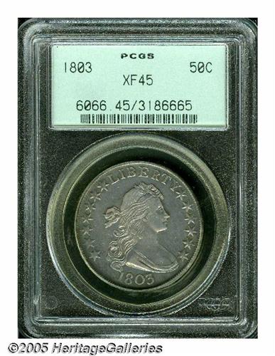 <B>1803<50C> Large 3 XF45 PCGS.</B></I> O-101, R.3. Variegated lavender and cream-gray colors envelop this nicely struck and lightly circulated Draped Bust Half. An original and unmarked piece. The date and other obverse design elements are boldly clashed onto the reverse die, as made. In a green label holder.<BR><I>From The Empire State Collection.</B></I>