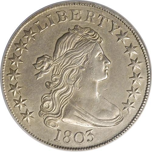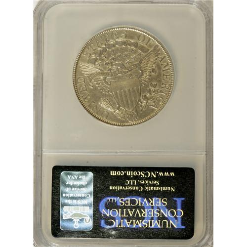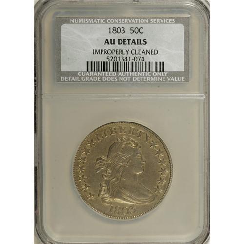 <B>1803 50C Small 3--Improperly Cleaned--NCS. AU Details.</B></I> O-104, R.3. The Small 3 is certainly scarcer than its Large 3 counterpart, although O-102 is also elusive. This example is evenly struck and has only slight wear on the drapery, cheek, and forehead. Almond-gold toning overlies the subdued and moderately abraded dove-gray surfaces.<BR><BR><b>Shipping:</b> Coins & Currency (<a target="_blank" href="http://www.heritageauctions.com/common/shipping.php">view shipping information</a>)