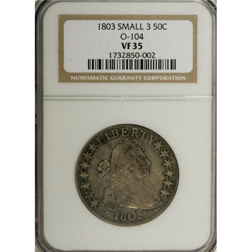 <B>1803 50C Small 3 VF35 NGC.</B></I> O-104, R.3. Faint mint luster still clings to the silver-gold and smoke-gray surfaces. E PLURIBUS UNUM is faint but still fully readable (due to strike, not wear). The peripheral elements are pleasingly well detailed, while the central portions retain deep detail, consistent with the grade.<BR><BR><b>Shipping:</b> Coins & Currency (<a target="_blank" href="http://www.heritageauctions.com/common/shipping.php">view shipping information</a>)
