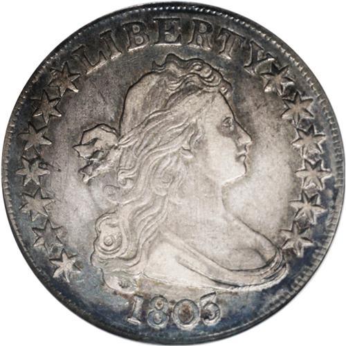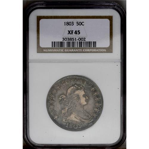 <B>1803<50C> Small 3 XF45 NGC.</B></I> O-104, R.3. The only Small 3 die marriage for the year, which is also the second rarest variety for the year. The Small 3 is distinguished from the Large 3 by its lack of the upper left serif that is present on the Large 3 style. Variegated medium gray, mauve, and electric-blue patination bathes each side. Generally well struck, except for some softness in the star centers on each side and on the eagle's neck and head. Well centered with most of the dentilation showing. A few minute, unobtrusive marks on Liberty's neck and chest and in the left (facing) obverse field are mentioned solely for accuracy. A pleasing early half dollar.