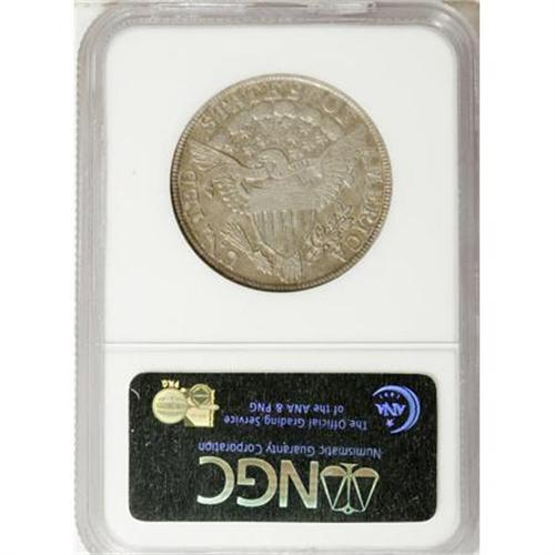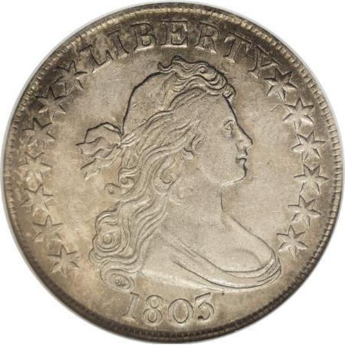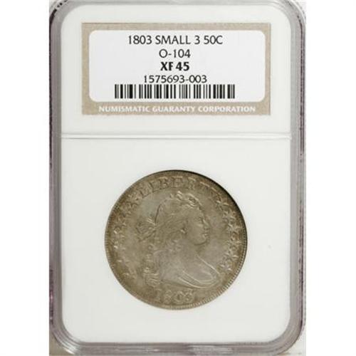 <B>1803 50C Small 3 XF45 NGC.</B></I> O-104, R.3. The only Small 3 variety, in great demand due to its listing in the <I>Guide Book</B></I>. Light circulation is evident on the higher points of the design, yet the surfaces are smooth for a coin that has served its intended purpose in commerce. Olive-gold and slate-gray color predominate, with traces of luster remaining in the recessed areas. Tough to find in nicer grades.<BR><BR><B>Coin Engraver:</B> Robert Scot<BR><BR><b>Shipping:</b> Coins & Currency (<a target="_blank" href="http://www.heritageauctions.com/common/shipping.php">view shipping information</a>\)