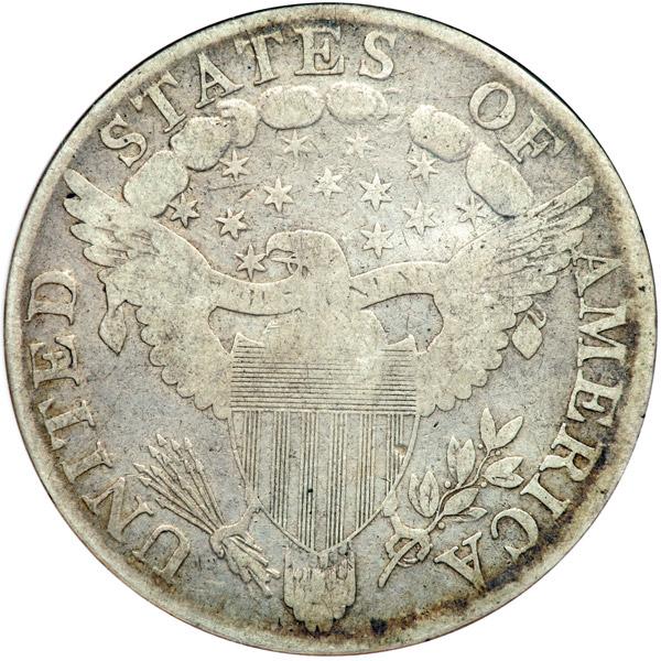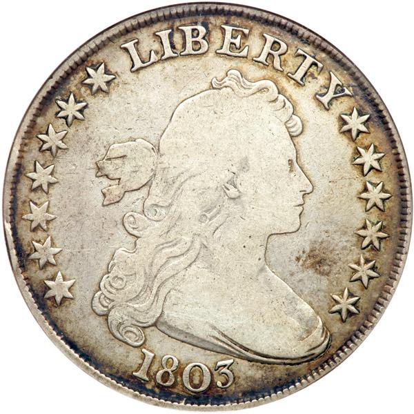 1803 B-5, BB-252 Rarity 3. ANACS graded VG-10. Evenly worn on both sides, light in color though tending toward russet-gray at the margin and around the stars and legends. Has a small rim bruise by the second and third stars (PCGS # 6900) .