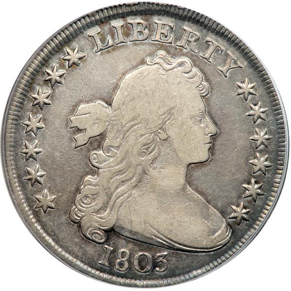 1803 Draped Bust Dollar. Small 3. PCGS graded VF-20. Housed in a new secure plus holder. Soothing antique grey hues blanket both sides. A splash of gold and blue toning can be seen here and there about the borders.