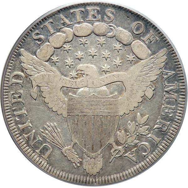 Reverse C: AM touch at base. Point of star touches point of lower part of eagle's beak. Very short stem in claw. Right edge of right foot of A over edge of cloud 4 (the only such instance for a dollar of 1803). Reverse die used to strike 1803 BB-256 only.