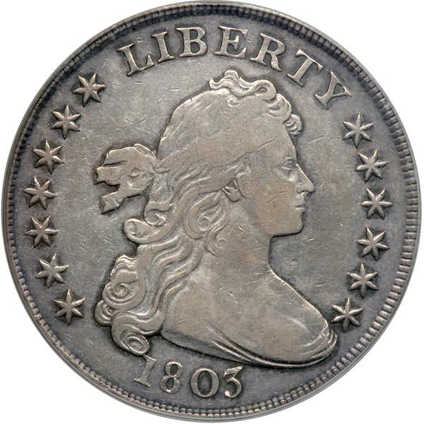 1803. Small 3. B-4; BB-254. Rarity 3. PCGS graded VF-20. Lightly toned, deepening within the devices. This is an attractive last-year Bust Dollar in which the 3 in the date is from a small device punch. Quite presentable. In an OGH (PCGS # 6900) .